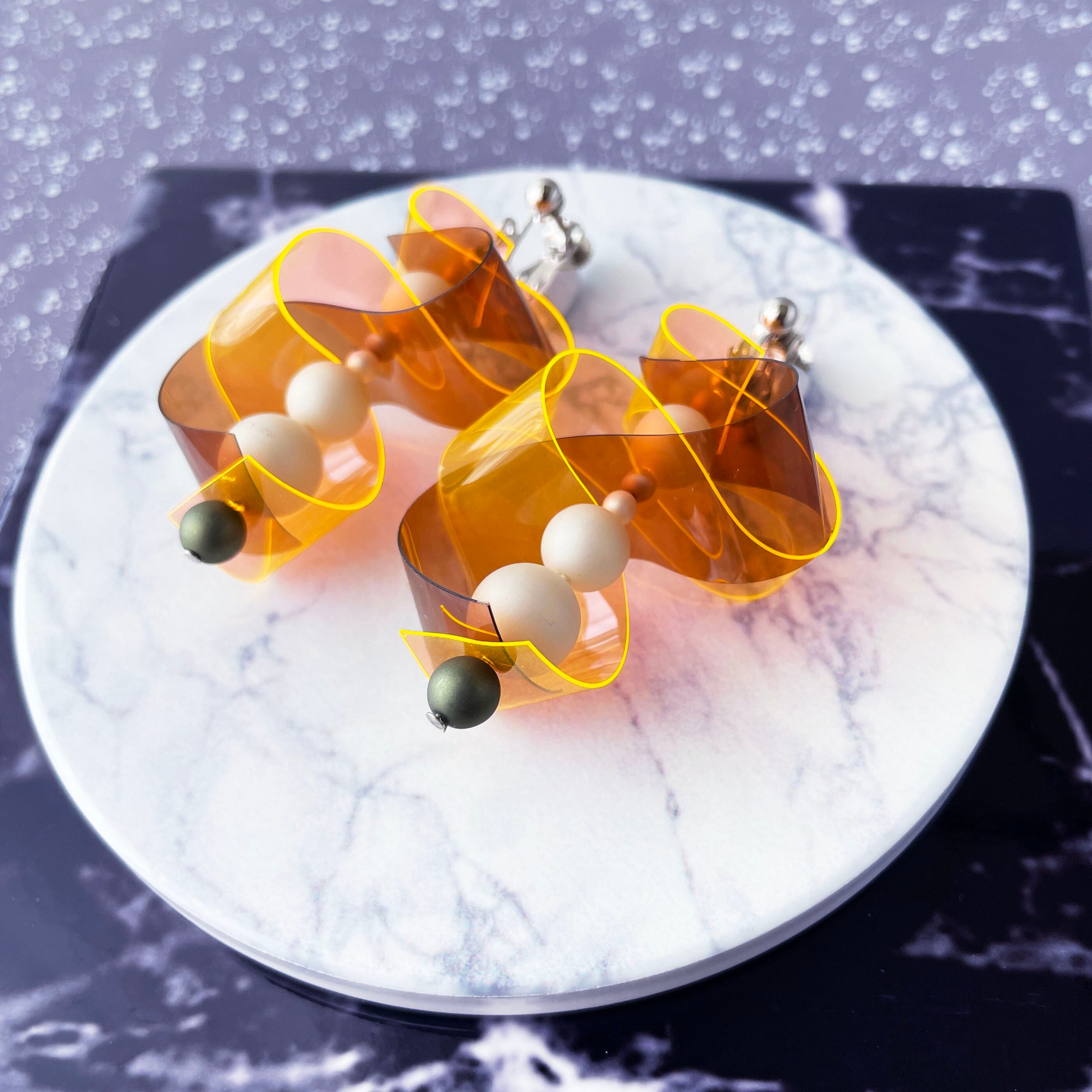 ビニール素材とつや消しパールを合わせたイヤリング/ピアスです。