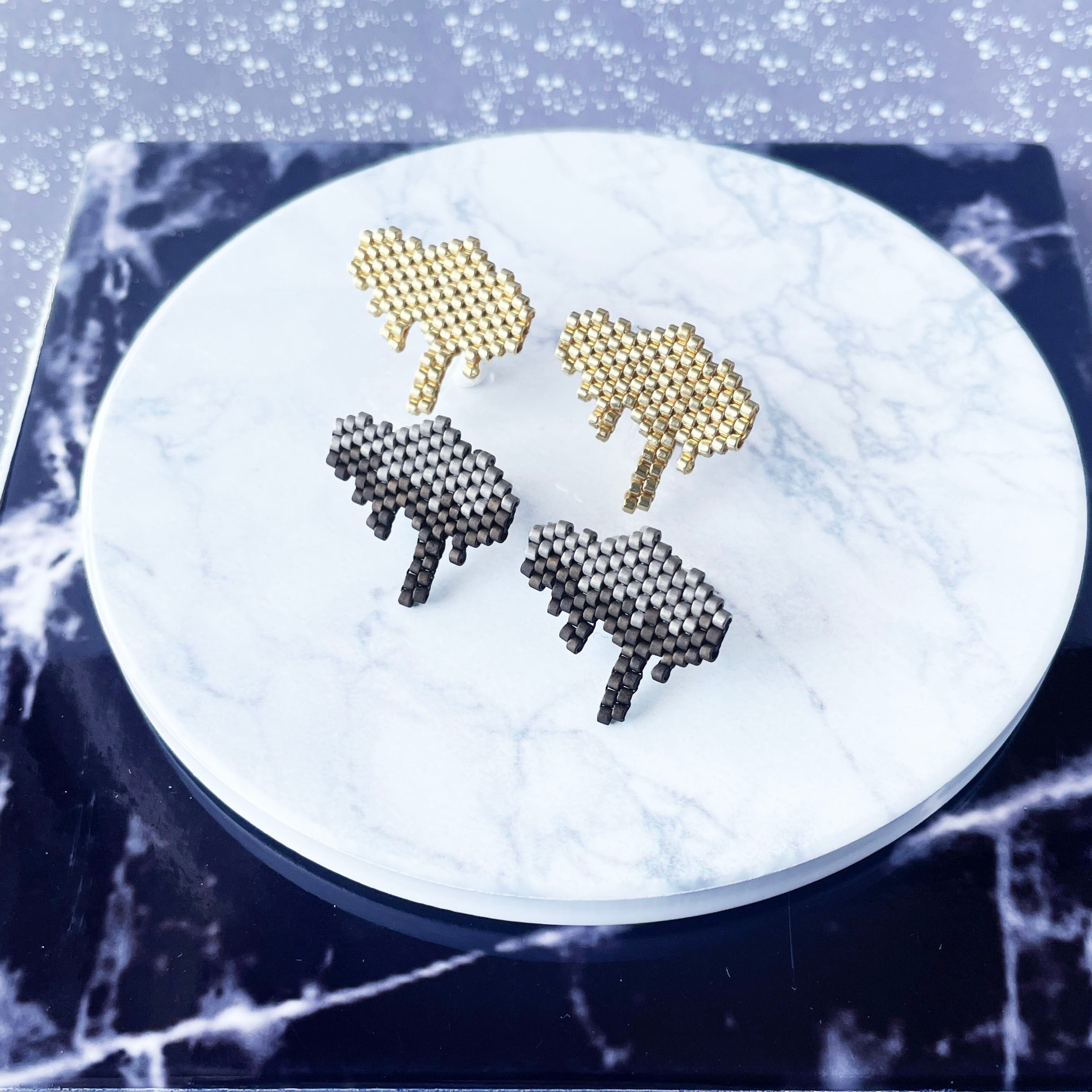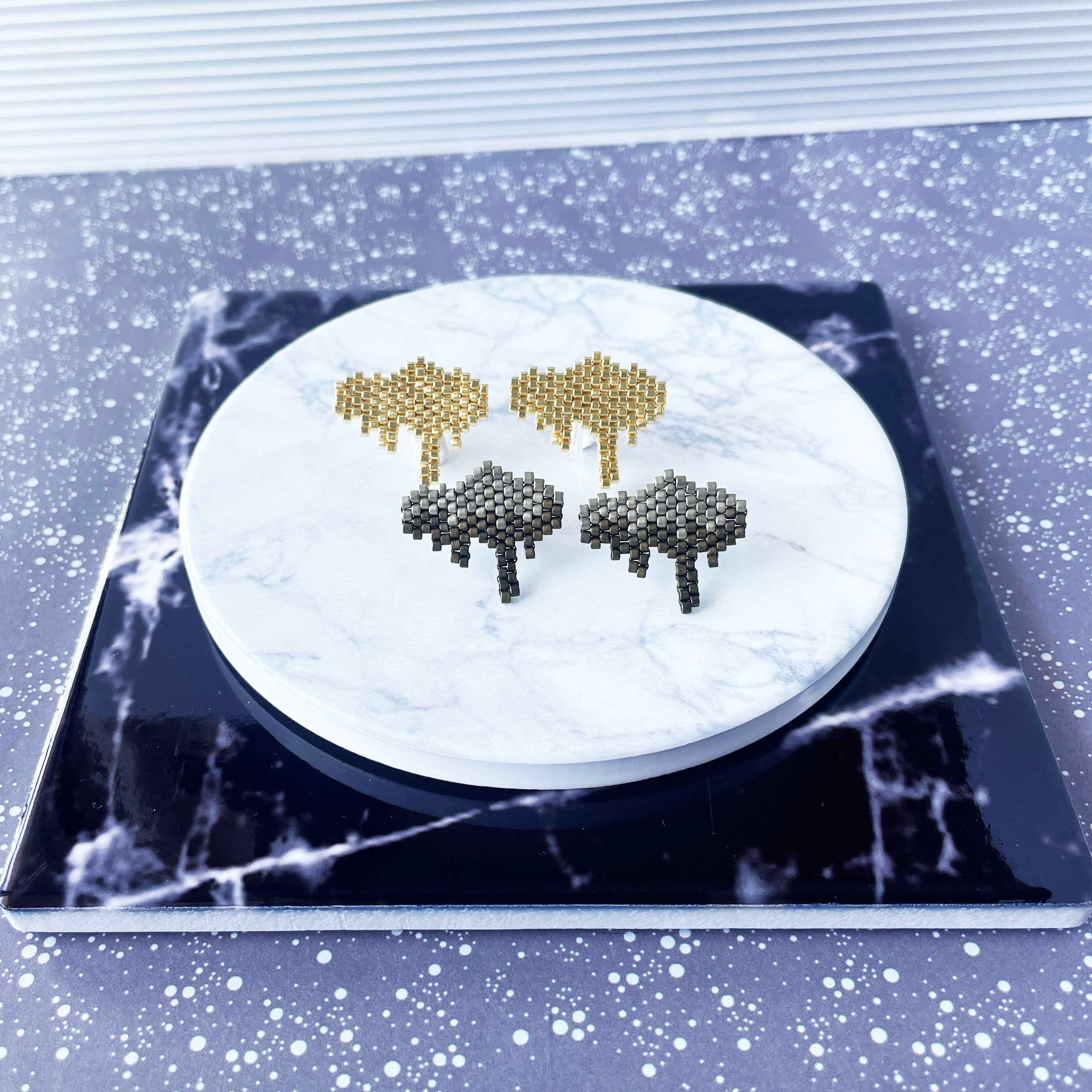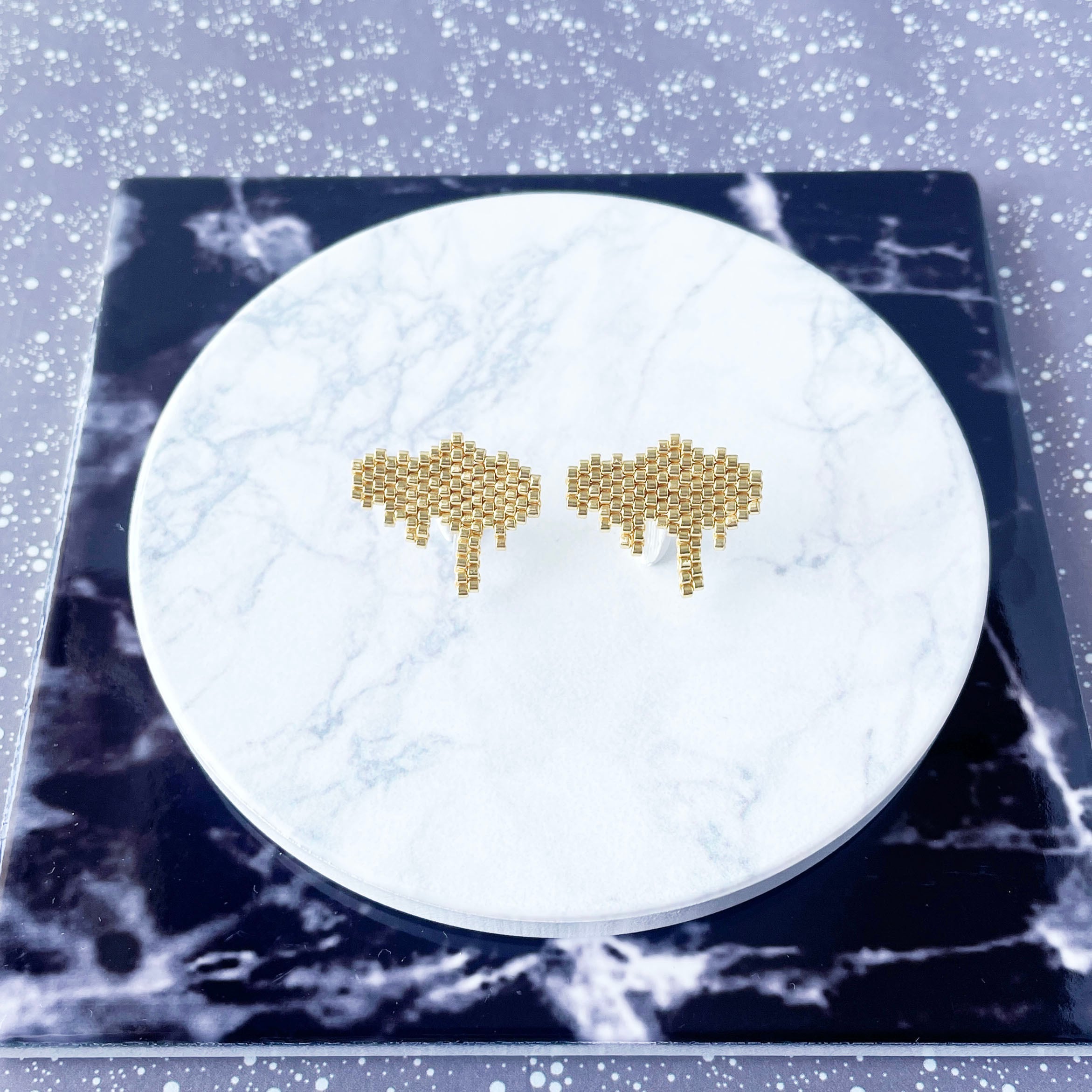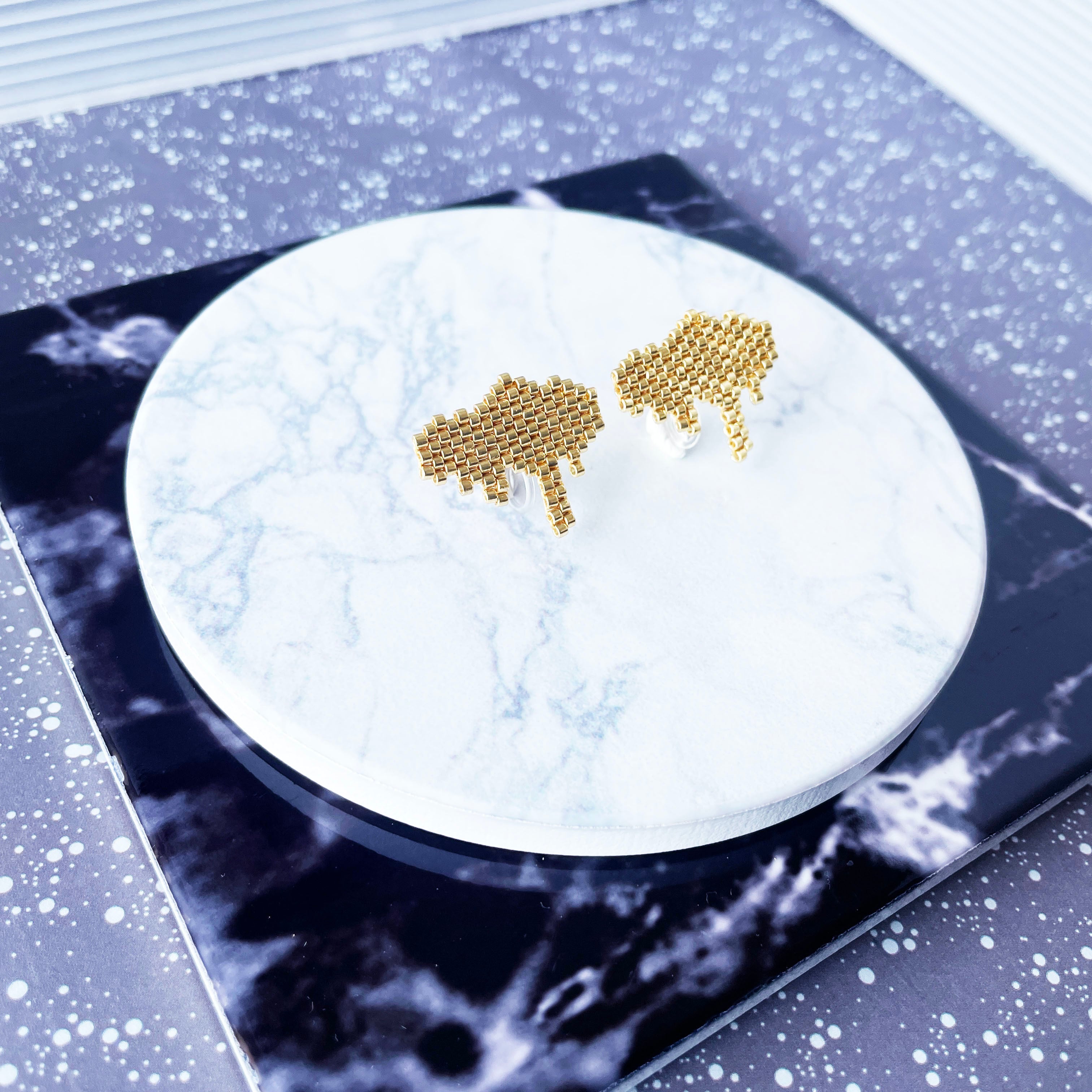 とろんと溶けたような形が特徴的なビーズステッチのイヤリング/ピアスです。